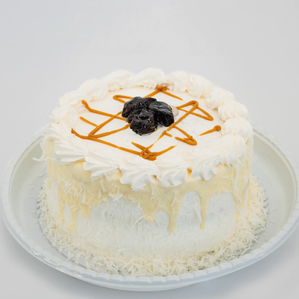 Massa branca, creme leve com ameixa, doce de leite, creme leve com coco, cobertura de chantilly, ameixa e coco.